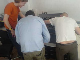 Actually it is no big big deal if a design studio gets a new printer. But this time it took three experts to get this thing moving.